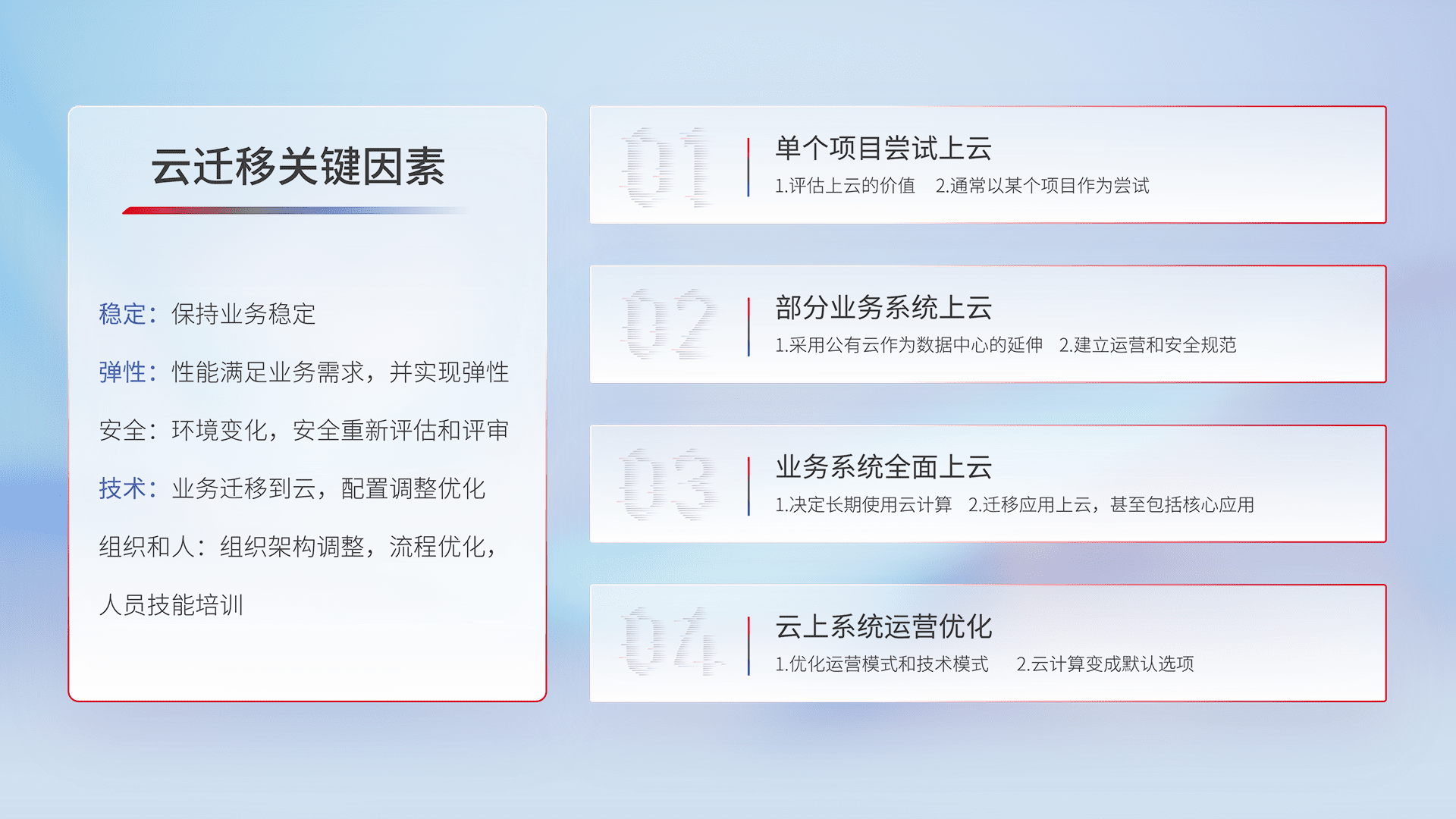 结合实际业务,,,,从规划设计、、、、云平台选型、、云原生改造、、、、数据迁移、、、集成交付,,,迁移全过程为客户识别最佳上云路径,,,做好风险识别管理,,设计网络架构、、、身份权限、、安全审计合规、、操作审计、、、、日志审计、、、、监控告警策略、、多站点容灾设计等,,,,对云上基础设施进行整体规划,,,提升IT治理水平,,,以满足弹性、、高可用、、高性能的需求。。。
