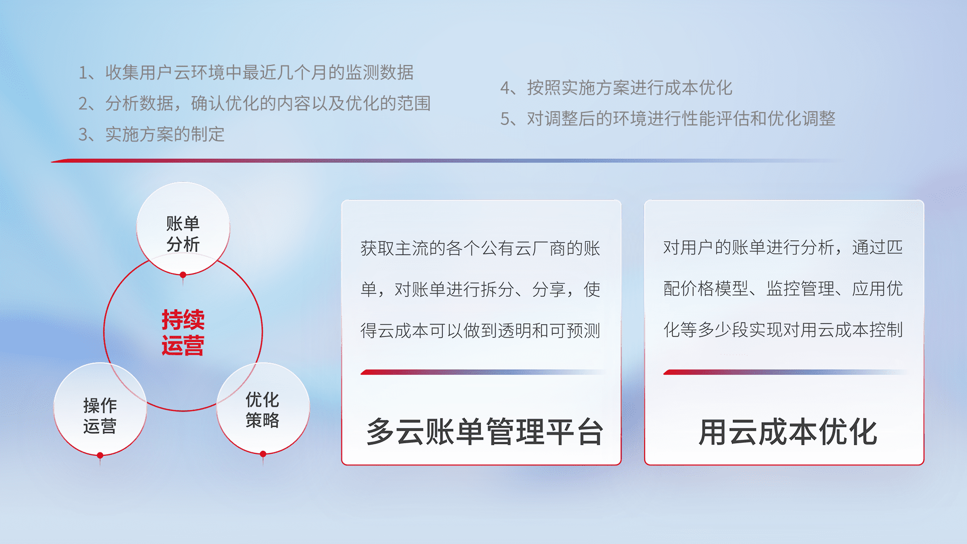 通过多云纳管,,,,以统一的资源数据模型把客户的云资源进行抽象和封装,,,进而实现对多云资源的统一操作,,,保障云资源管理的可靠性、、、稳定性与可用性。。量身定制化运维内容,,配置、、开发运维、、补丁管理、、、、备份、、监控、、认证和访问管理、、审计和日常巡检等,,,保障在用云过程中的可靠度,,,,稳定度以及高可用率。。