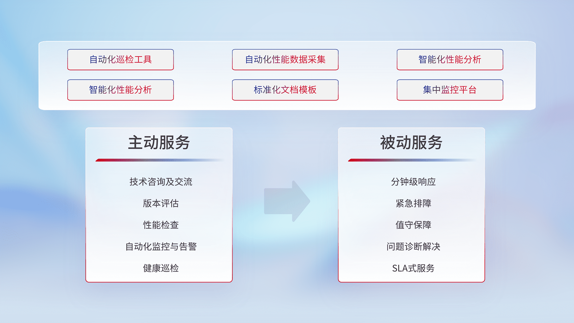 智能化工具和标准化文档,,,保障服务质量,,,,提供主动服务(包含技术咨询、、、版本评估、、、性能检查、、、自动化监控与告警、、、健康巡检)和被动服务包含(分钟级响应、、、紧急排障、、、、值守保障、、、问题诊断解决、、、SLA服务)。。。。